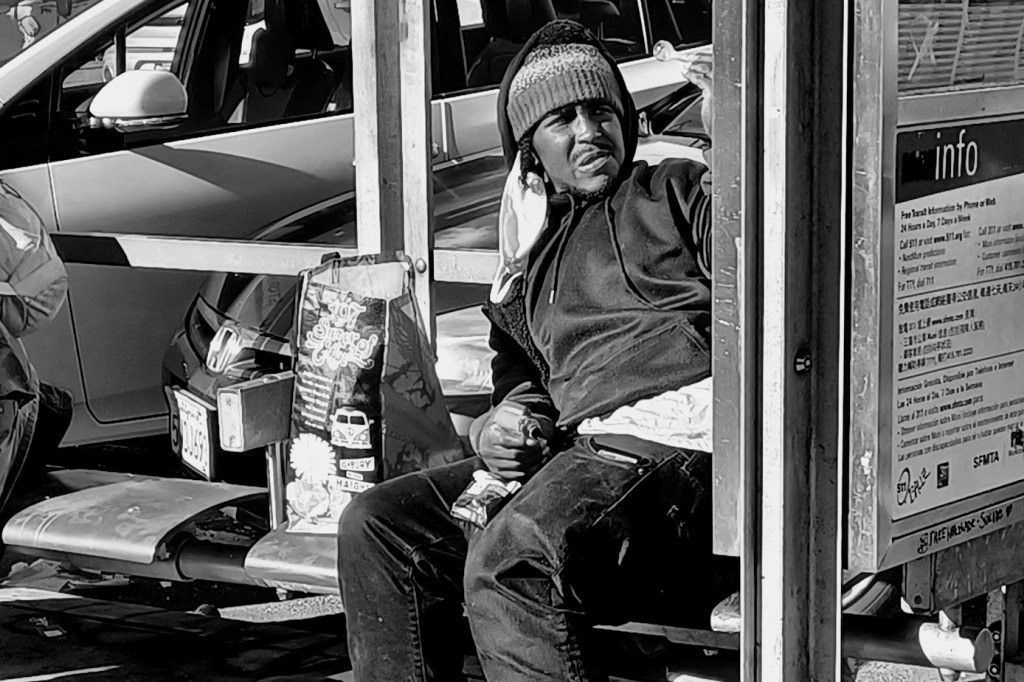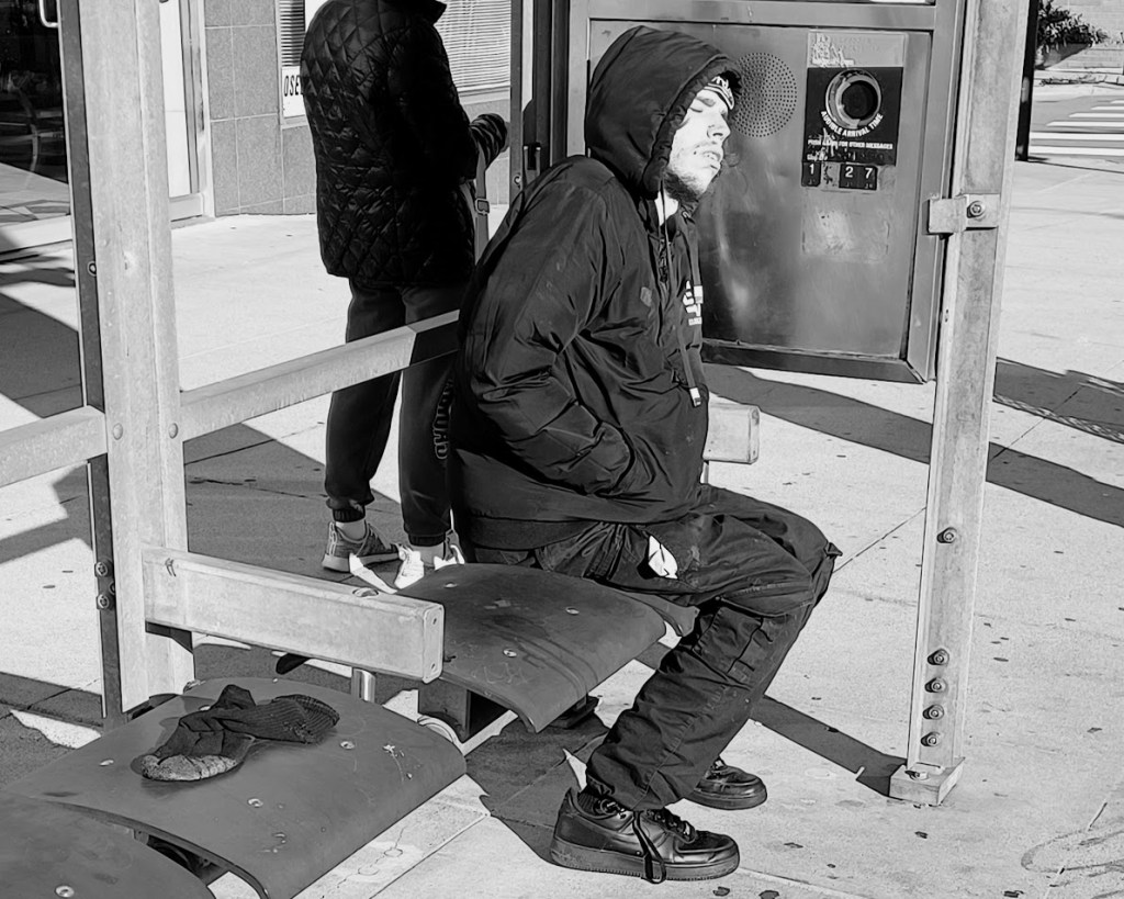 Top photo: Unhoused person at a bus stop – photo Lee Heidhues