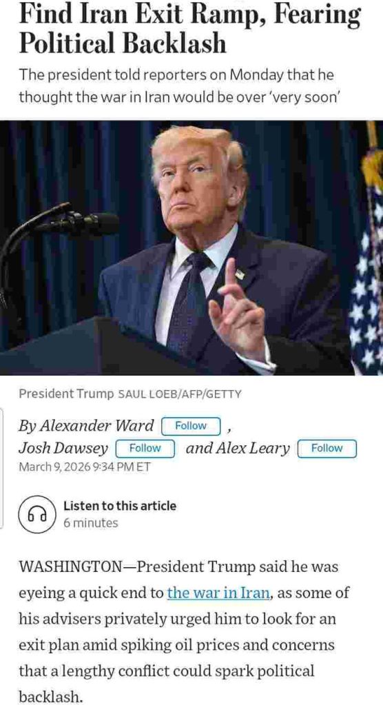 Trump needs to “Find Iran Exit Ramp ” – Wall Street Journal– 3.10.2026