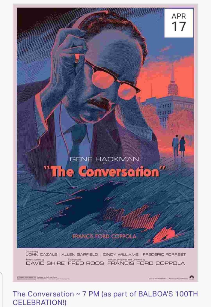 On April 17 two memorable movies and blogger favorites will be screened. ‘The Conversation’ (1974) filmed entirely in San Francisco. Along with ‘The Fugitive’ (1993). Harrison Ford has the lead role in ‘The Fugitive’. A younger Harrison Ford has a role in ‘The Conversation’.