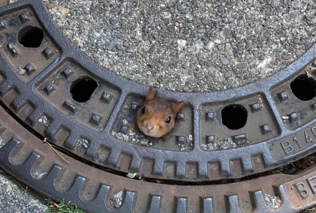 The squirrel was discovered with its head poking through the drain cover in the city’s Hainalle on Thursday morning. Emergency services were alerted around 10.30am.