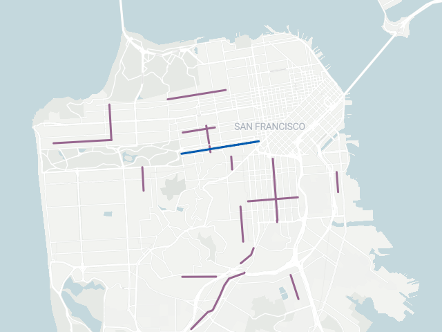 1 — Cabrillo Street 2 — 23rd Avenue 3 — Clay Street 4 — Golden Gate Avenue 5 — Lyon Street 6 — Noe Street 7 — 12th Avenue 8 — Shotwell Street 9 — 22nd Street 10 — Minnesota Street 11 — Sanchez Street 12 — Hearst Avenue 13 — Arlington Street 14 — Somerset Street 15 — Cayuga Avenue 16 — Page Street neighborway