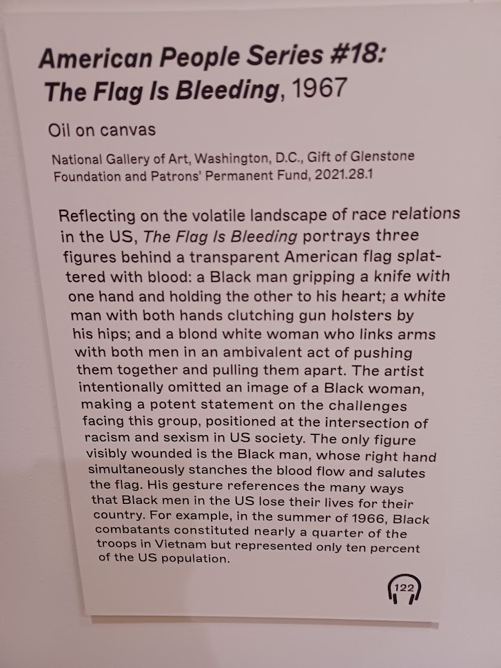 I first saw this painting, The Flag is Bleeding by Ruth Ringgold on November 8, 2019 at the DeYoung members only showing of ‘Soul of a Nation.’