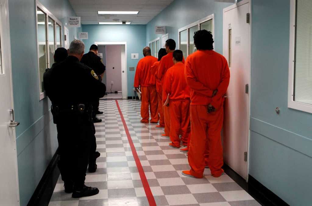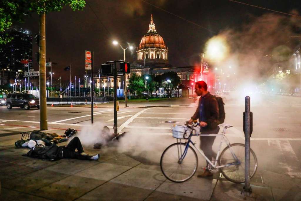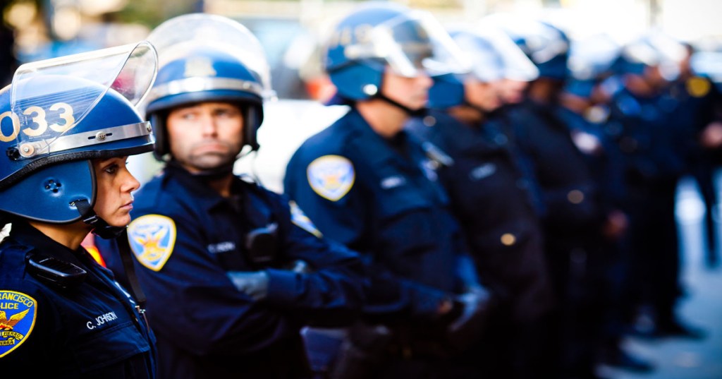 A line of SFPD officers in riot gear block Occupy SF Protesters after clearing them from Market Street. Three people were arrested for blocking Market Street for about an hour while protesting an early morning raid of the Occupy SF encampment The unhoused sleep one block from San Francisco City HallAn inferno in a San Francisco neighborhoodSheriff’s deputies escort prisoners back to their cells after attending classes at the San Francisco County Jail in San Bruno, Calif.Fire destroys historic watering hole in San FranciscoSigns of the times in San Francisco