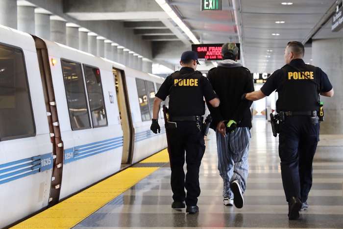 Transit cops detaining a passenger