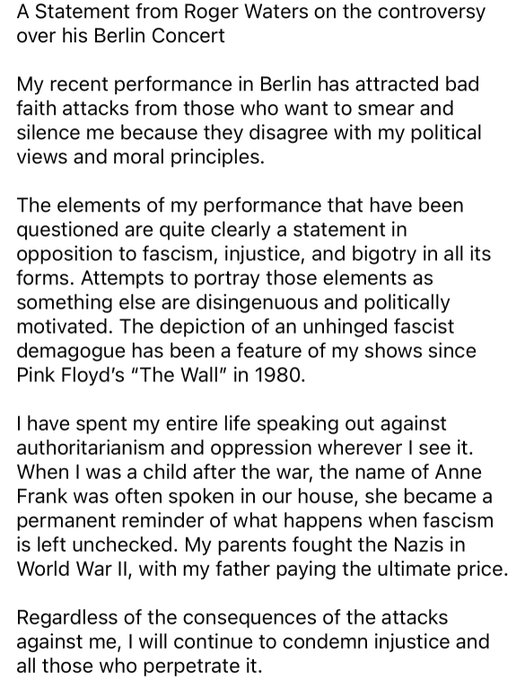 “Good morning to every one but Roger Waters who spent the evening in Berlin (Yes Berlin) desecrating the memory of Anne Frank and the 6 million Jews murdered in the Holocaust,” Israel’s Foreign Ministry tweeted earlier this week.