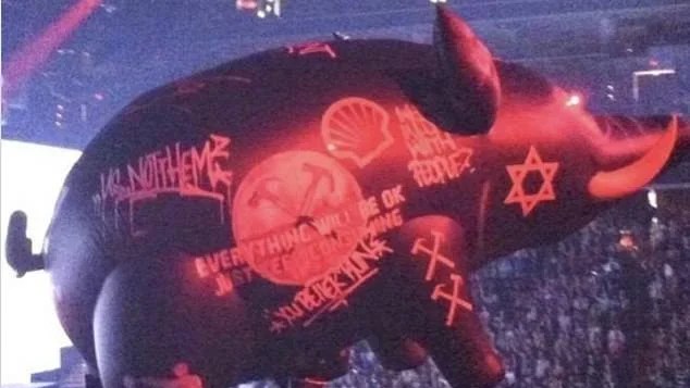 Waters’ shows also often feature giant inflatable pigs emblazoned with aggressive or brooding slogans. Some of these had the Star of David painted on them.