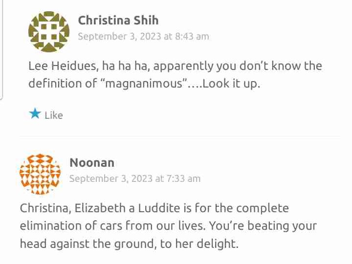 Liz and I have been subjected to a litany of vitriolic comments for posting our opinion in The Richmond Review. By entitled motorists who lost at the Board of Supervisors, the ballot box and the courtroom in their well funded efforts to maintain their hegemony.