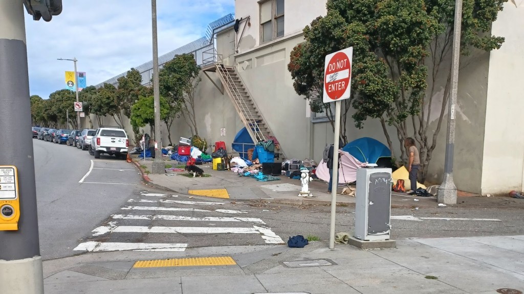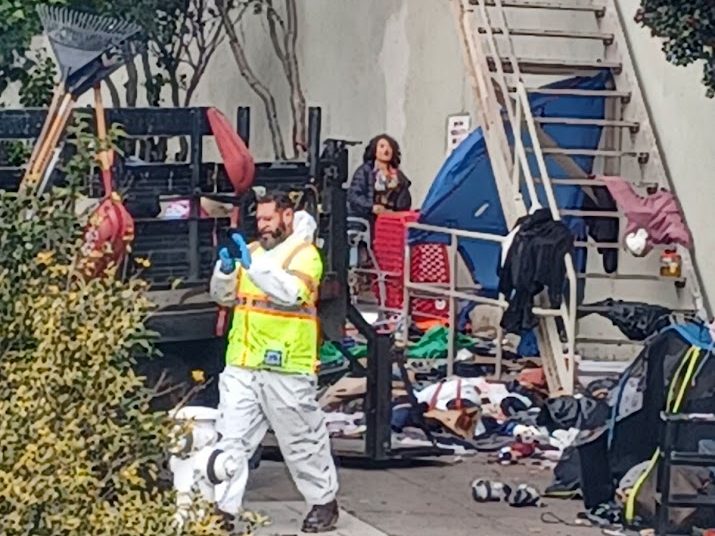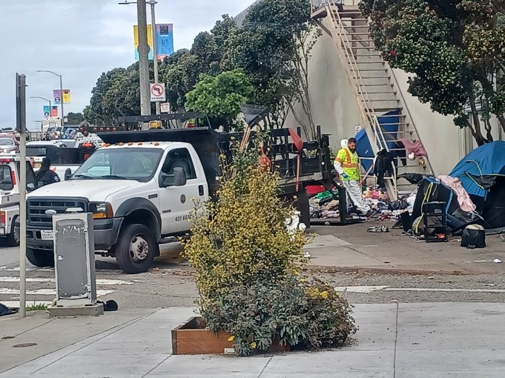 San Francisco city workers rousting the unhoused and tossing their meagre belongings into trucks.