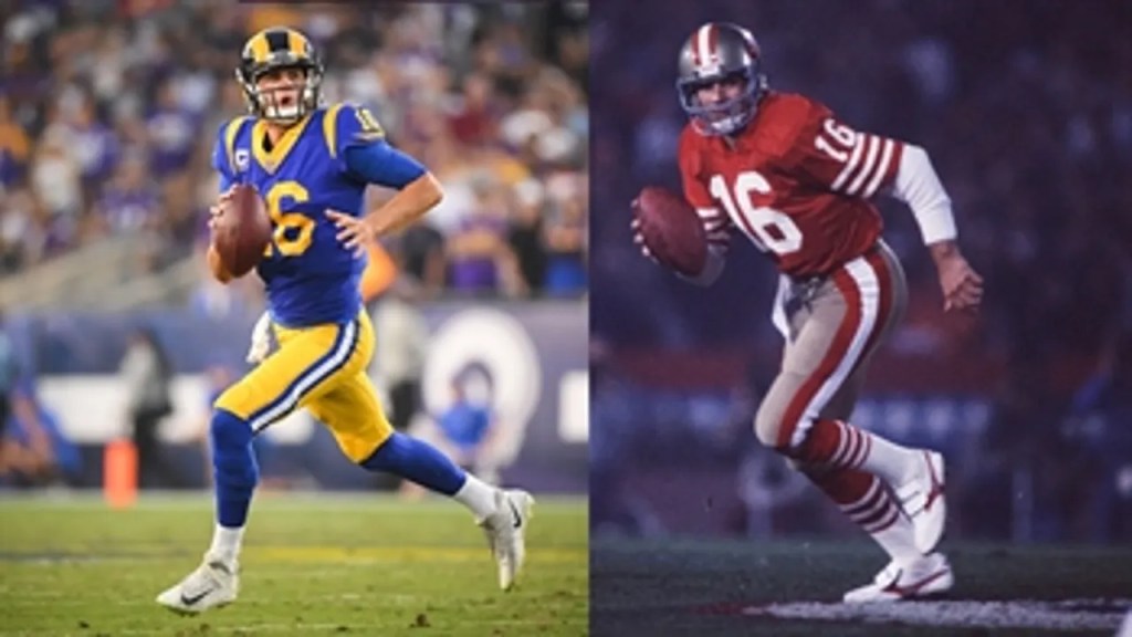 Trying to best the favored Niners. The team he grew up following. His hero, according to media reports, 49er Hall of Fame quarterback Joe Montana. Number 16. The number worn today by Jared Goff.