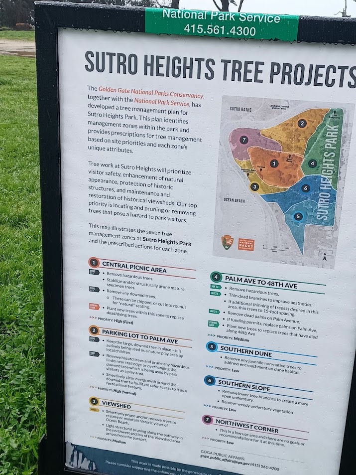 I came upon the sign posted on the pathway announcing that a major renovation project is soon to begin. Most distressing is Number 3-VIEWSHED which will “Selectively prune and/or remove trees to restore or maintain historic views of Ocean Beach.” I walk by this spot on an almost daily basis. There is absolutely no need to touch this spot. It is beautiful in its current status.