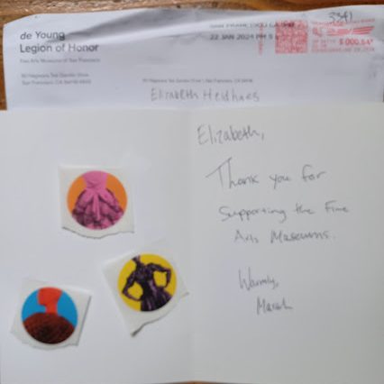 Liz received a very kind message in today’s mail from The Fine Arts Museums of San Francisco “Thank you for supporting the Fine Arts Museums.”
