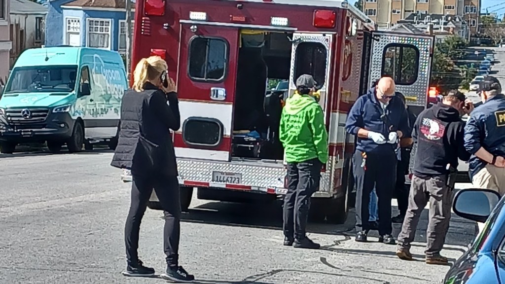 Cycling home up Anza Street from my daily walk in Sutro Park I came upon a posse of San Francisco cops, health department and emergency medical staff.