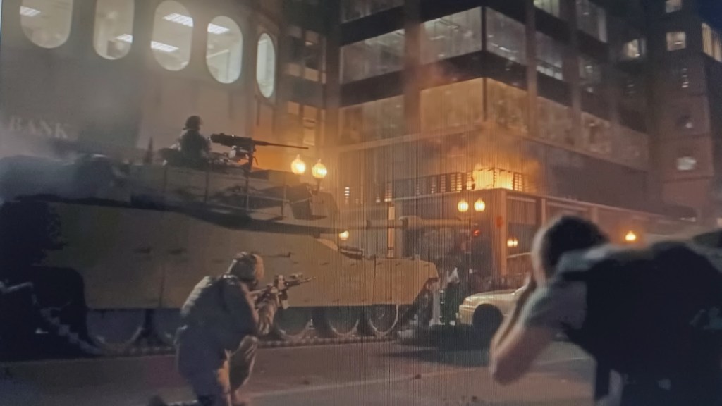 We sat mesmerized as the whirr of helicopters and staccato rat-a-tat-tats of machine guns exploded across the giant screen of “Civil War (2024)”, a genius of a war film which opened Friday at the AMC Kabuki in San Francisco.