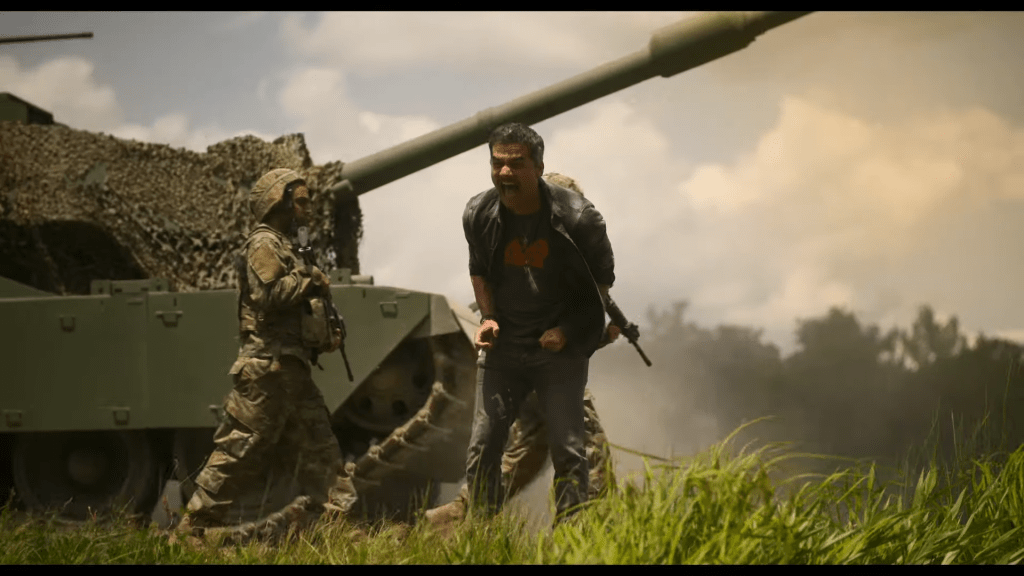 This corps of journalists wearing “Press” flak jackets now commands the screen. The lurid circus of civil insurrection has begun. Journalists must photograph and record it from every angle, even to the point of insanity and the sacrifice of their own lives. “Civil War (2024)” transfuses our veins with the adrenaline that is the grueling, shocking, and unforgettable drug of war.