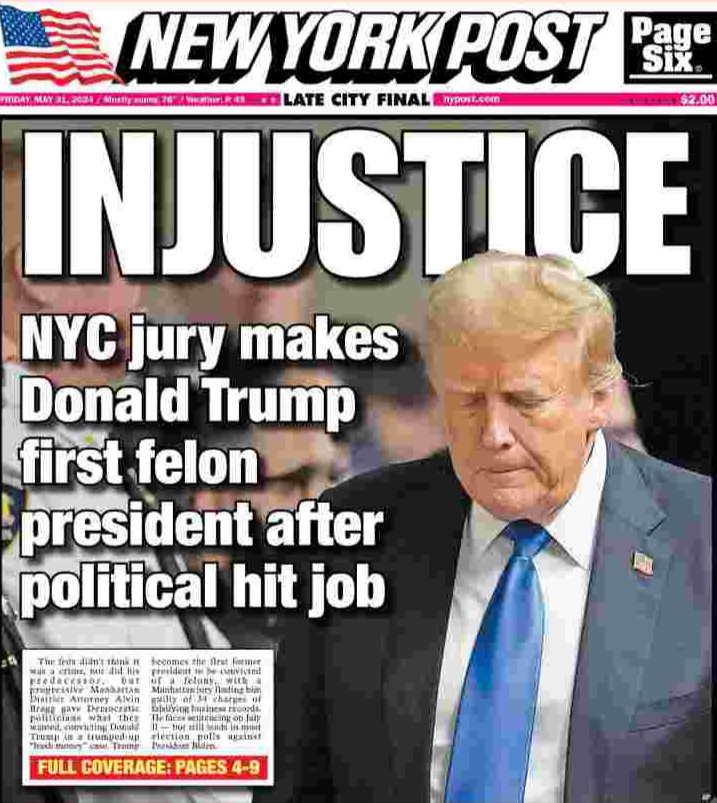 It’s disconcerting to read the post conviction reports and realize that too many Americans are buying in to Trump’s incendiary and dangerous rhetoric. Rupert Murdoch’s MAGA tabloid rag The New York Post says it all with the screaming headline INJUSTICE.