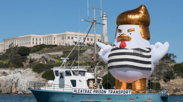 The lookalike balloon was a $450 purchase Morton made off the internet in 2017, originally manufactured in China around the time of Trump’s inauguration and Lunar New Year celebrations that year (it was the Year of the Rooster, and a Chinese balloon maker seized on the similarities with an existing rooster balloon they had). She later added a black-and-white-striped prison shirt — for a 2018 cruise across the Bay to Alcatraz, six years before Trump was actually convicted of 34 felonies.
