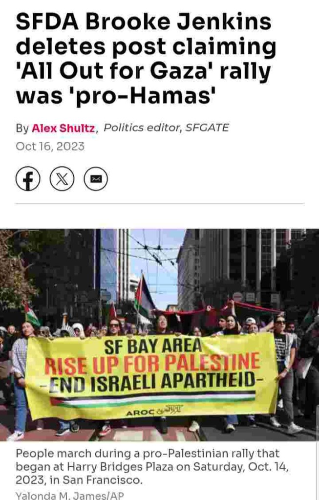 Shameless political creature San Francisco District Attorney Brooke Jenkins who compared legitimate peaceful protesters to Hamas terrorists is using her office to harass and abuse.
