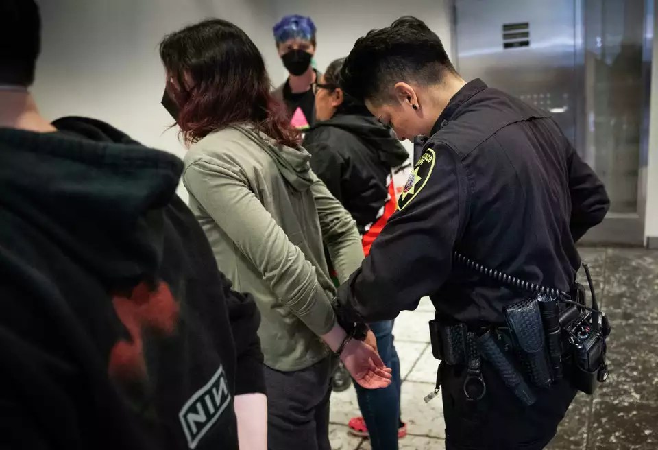 Twenty-one of the 26 people filed into the San Francisco Sheriff’s Office building downtown around 8 a.m., while dozens of others chanted, banged on drums and scrawled notes of support in chalk on the nearby sidewalk. One of the people charged raised a defiant fist as their group entered the building, prompting an eruption of cheers from the crowd.