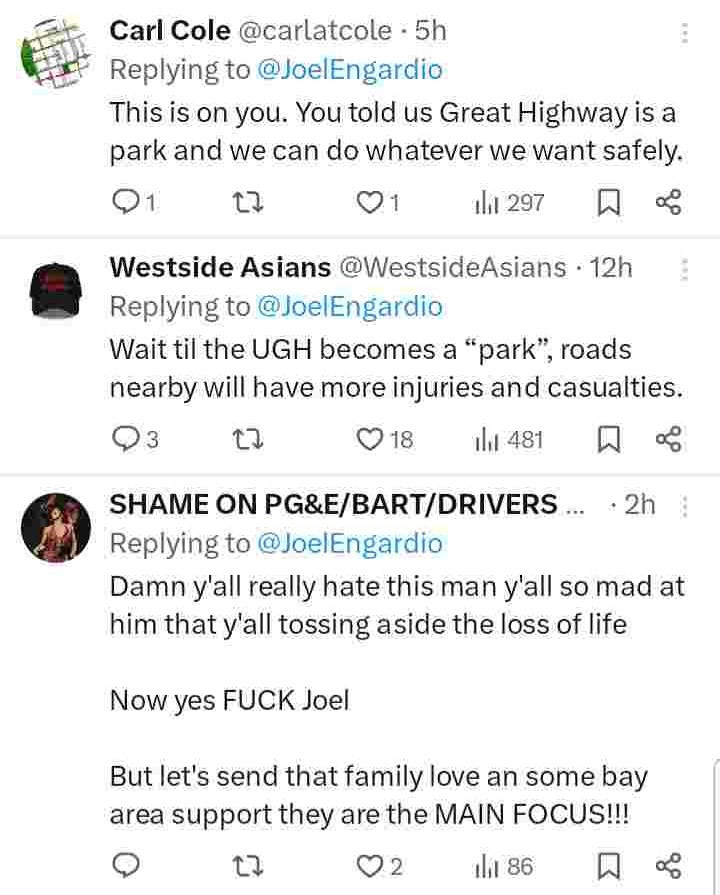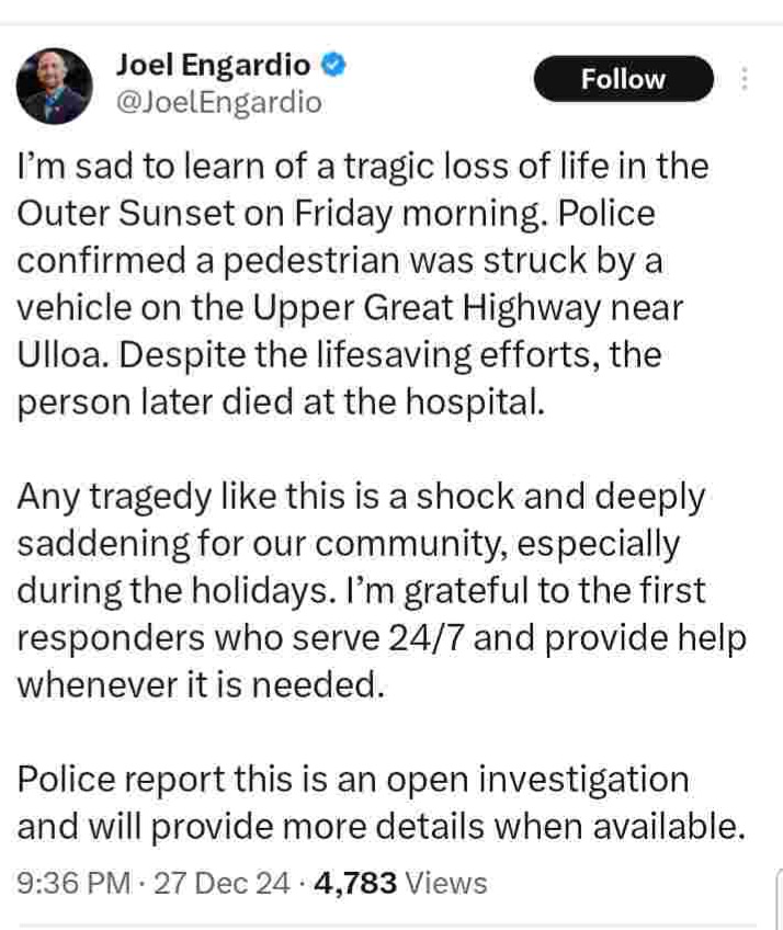 Hours before this incendiary and pandering to the motorists article was published an elderly pedestrian was cut down and killed by a motorist on the soon to be permanently car free Great Highway Park.