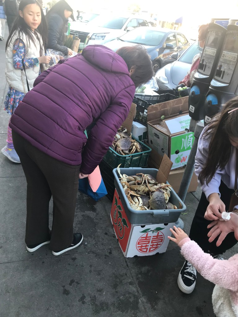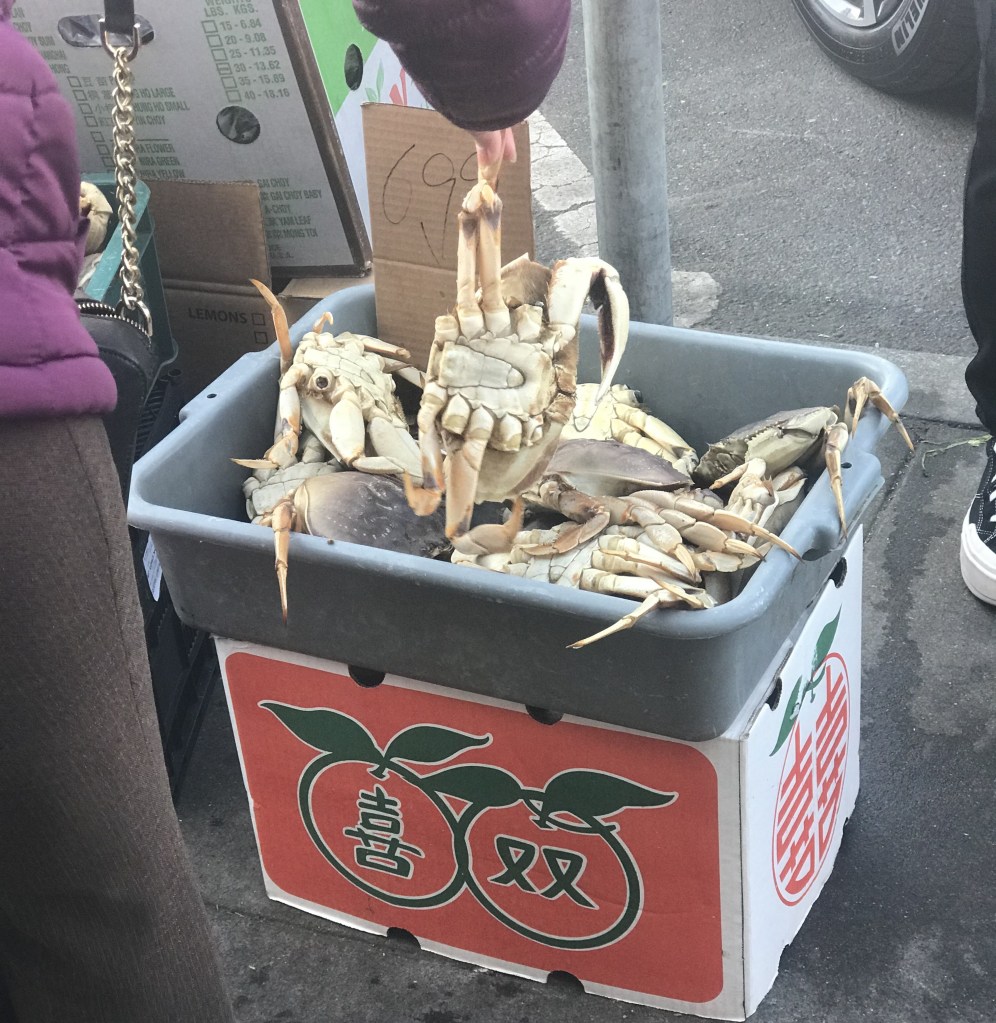 I saw a vendor selling live Dungeness crabs, many with legs broken off, to a throng of captivated shoppers.