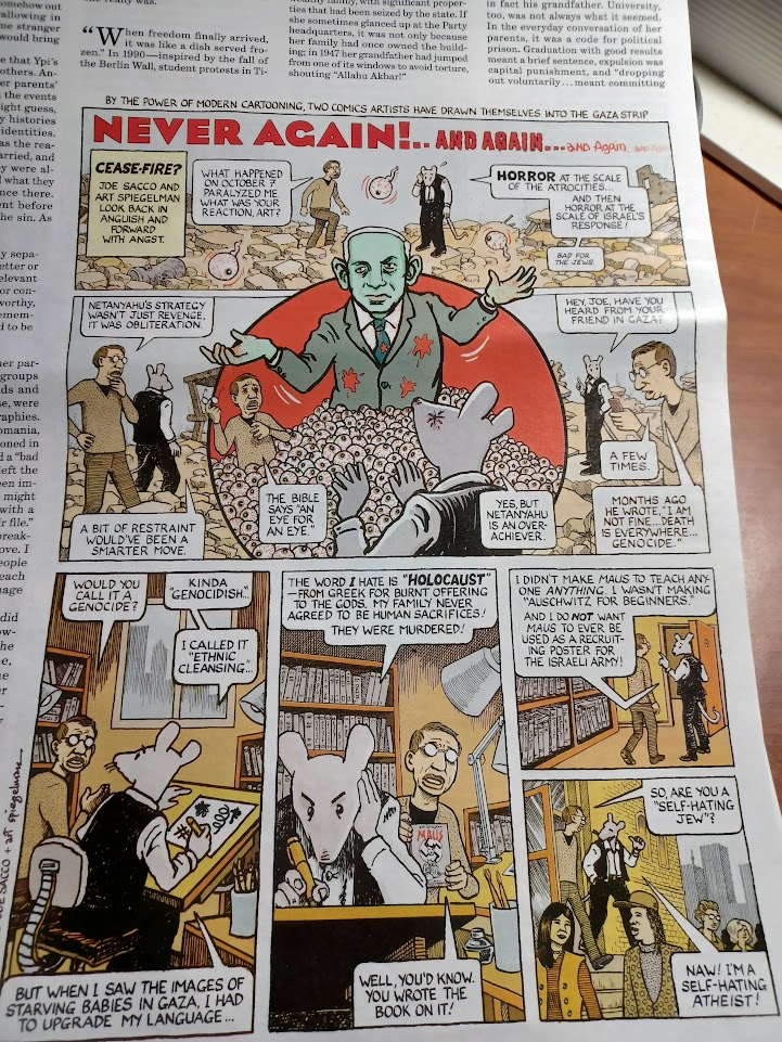 The February 27, 2025 issue of the oft times staid New York Review of Books (NYRB) is running a brief, powerful indictment of the Israeli government titledNEVER AGAIN..AND AGAIN…AND AGAIN..AND AGAIN. By the Power of Modern Cartooning, Two Comic Artists Have Drawn Themselves Into The Gaza Strip.