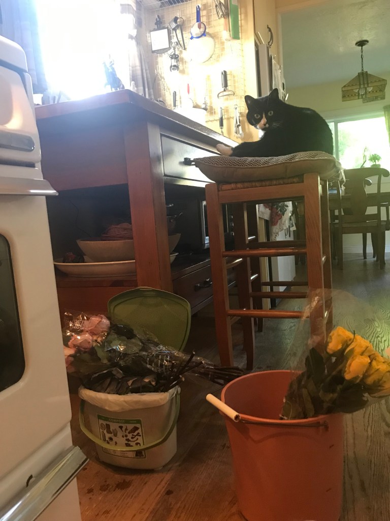 Bendi admires roses soon to adorn the front gate Peace symbol.