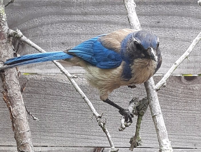 It’s so nice to have a native bird inhabiting our backyard. A pair of California scrub jays arrive late in the afternoon while I am cleaning the area. They are not shy. One in particular comes within several feet of me and we eyeball each other.