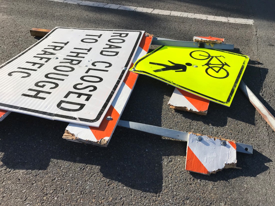 While documenting the Wreckage of a Slow Streets barrier by the dual crimes of hit-and-run and vandalism, I heard a car pull up and stop behind my back.