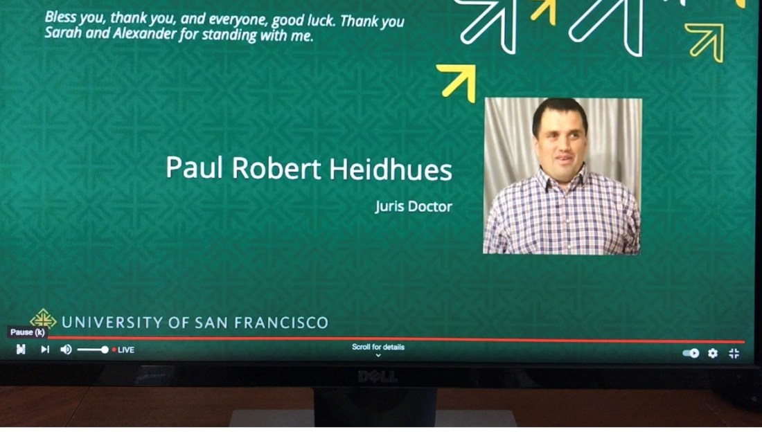 The past nearly four years Paul has worked, raised a family and attended University of San Francisco Law School at night. Paul has overcome many hurdles, not the least of which is the fact Paul is visually impaired. Paul fought for the accommodations he needed from the USF Law School Administration. Paul prevailed. He attended class and completed the arduous workload before and during the Pandemic when San Francisco was transformed into a Virtual City.