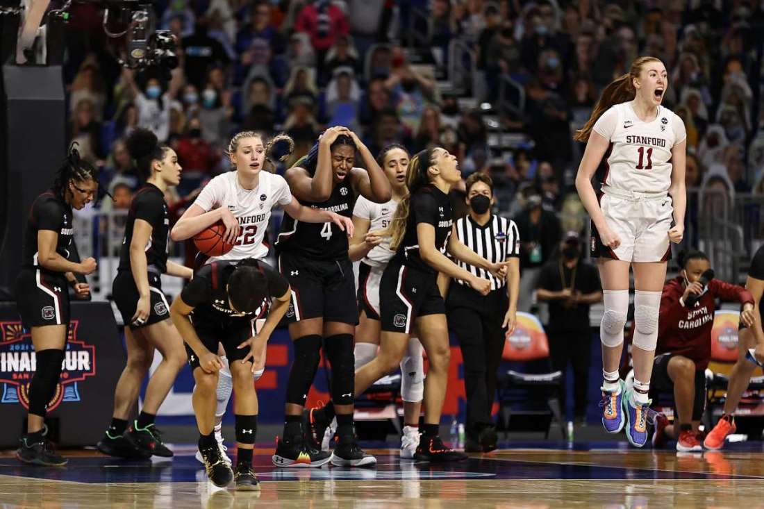 SAN ANTONIO, TEXAS – APRIL 04: Members of the Stanford Cardinal celebrate the team’s win against the Arizona Wildcats in the National Championship game of the 2021 NCAA Women’s Basketball Tournament at the Alamodome on April 04, 2021 in San Antonio, Texas. (Photo by Carmen Mandato/Getty Images)