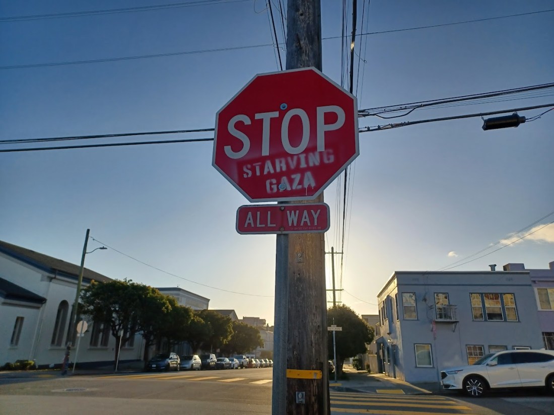 The revulsion at the continuing Israeli onslaught has people speaking out in the quiet outer Richmond District of San Francisco. At the intersection of 36th Avenue and Anza Street all four STOP Signs are emblazoned with a reminder to the neighborhood.