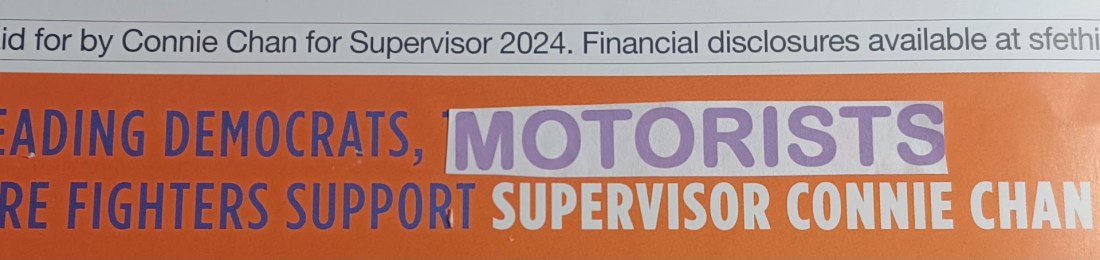 Connie Chan campaign mailer. Edited to tell the truth about her genuine priorities. “CONNIE CHAN FIGHTS FOR US MOTORISTS.”