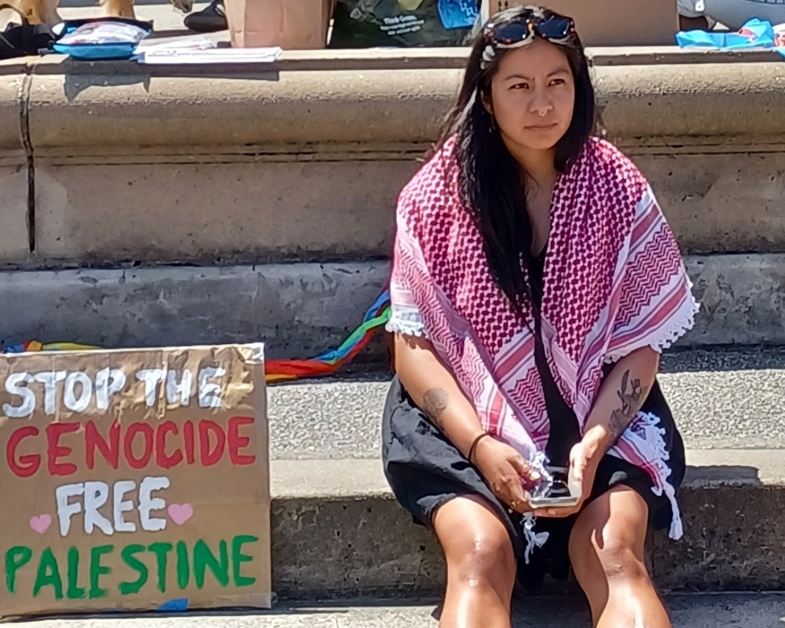 A main speaker at the event was Dr. Aleks Liou (Phd. Columbia), currently Program Manager of Youth Action for the Planet at the California Academy of Sciences. Dr. Liou told the gathering about the devastation and death rained on the people of Gaza. He also talked about the cultural institutions of San Francisco which are major benefactors to the government of Israel which continues its murderous assault.