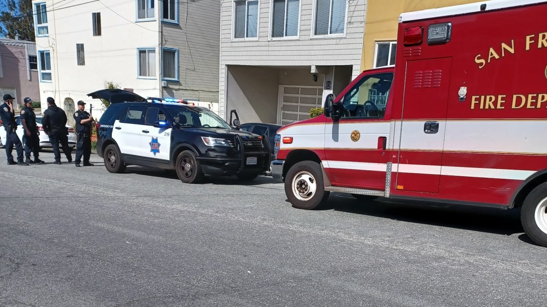 Cycling home up Anza Street from my daily walk in Sutro Park I came upon a posse of San Francisco cops, health department and emergency medical staff.