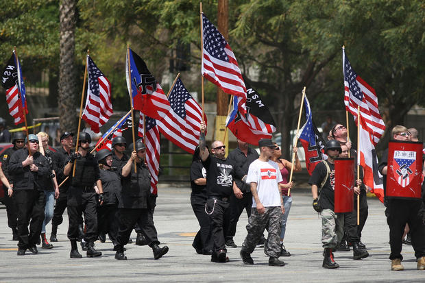 Members of the National Socialist Movement (NSM) march to their rally near City Hall on April 17, 2010 in Los Angeles, California. An NSM anti-illegal immigration rally in October in Riverside, California resulted in fights between the neo-Nazis and counter-protesters. (Photo by David McNew/Getty Images)