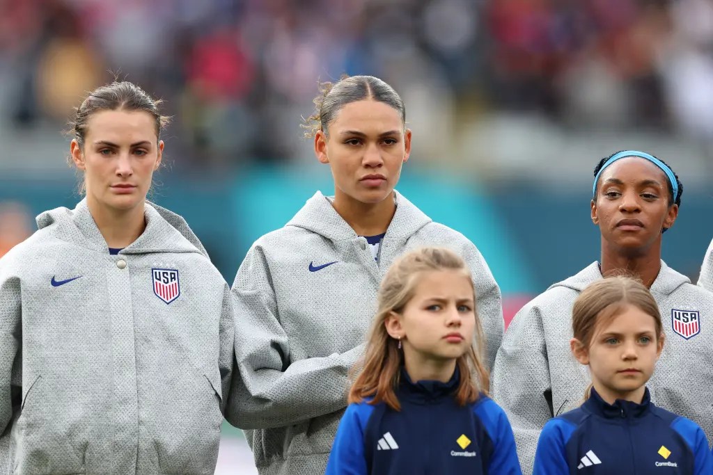The majority of the reigning women’s World Cup champion team stared stoically ahead as the “Star Spangled Banner” blasted across New Zealand’s Eden Park arena.