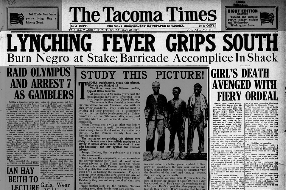Top photo: Tacoma Times 5.22.2017 Just as appalling as the “Lynching Fever Grips South” is the story underneath it headlined “Study This Picture.” Blatant anti-Asian racism on full display on page one above the fold.The Chinese Six Companies of San Francisco is the subject of criticism for wanting tobring Chinese workers into the Tacoma, Washington area.