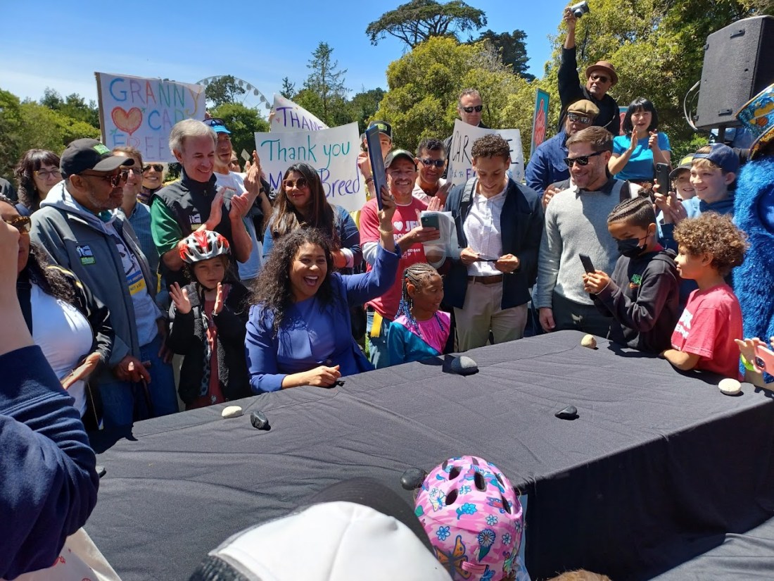 A large crowd gathered on a breezy sunny windswept afternoon as Mayor London Breed signed into law legislation designating a 1.5 strip of land car free forever. There was music, roller skating, dragon dancers, people of all ages, City officials who soaked in this momentous victory.