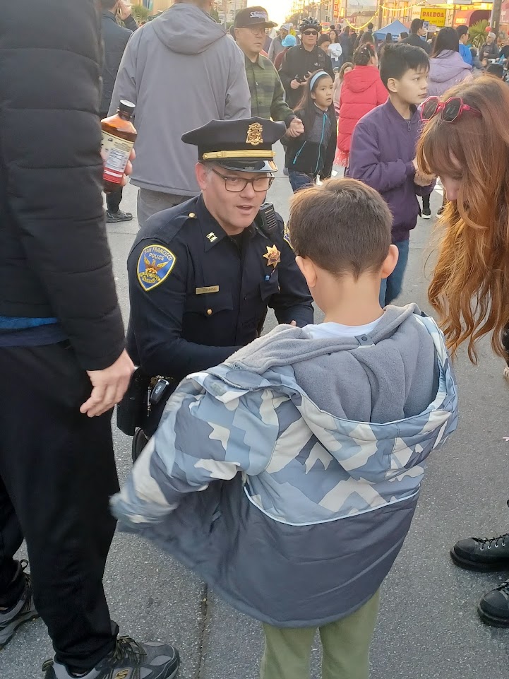 Chris Canning, Captain of the Richmond District Police Station chats with a young resident.