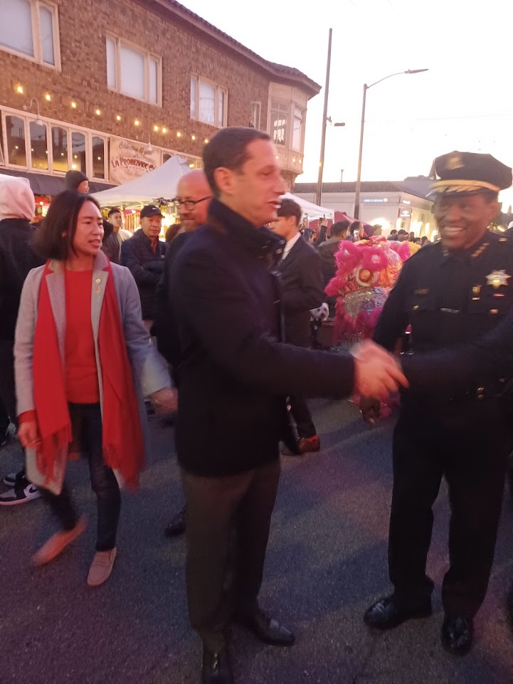 A neighborhood resident greets Supervisor ChanA diverse crowd of all ages checked out the Lunar Fest.