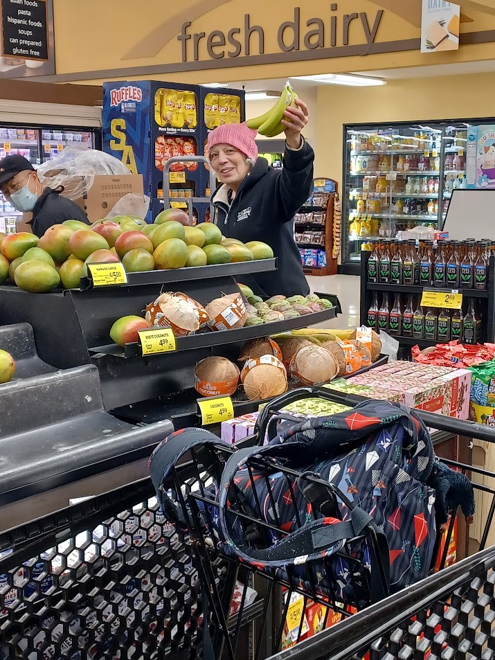 Liz in Safeway at the Beach holds aloft her organic bananas at the end of the trek.