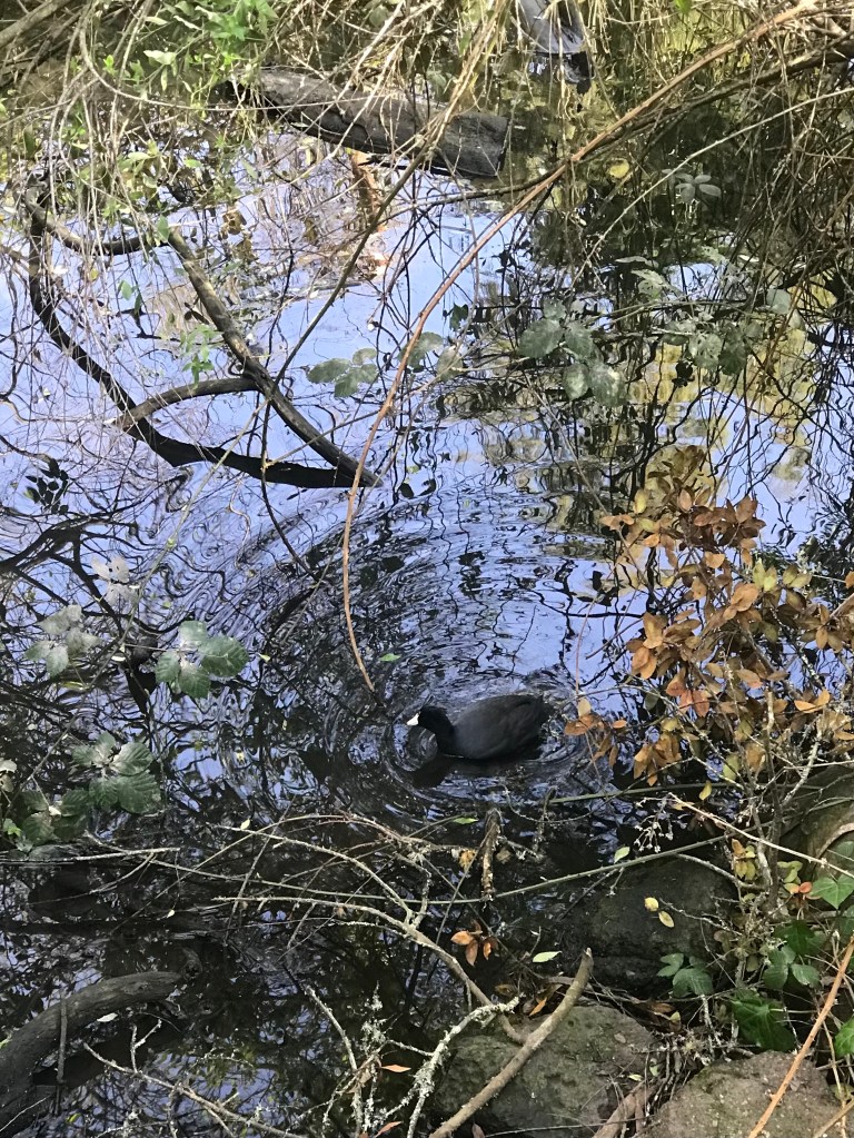 A coot in her home territory.Orange mushrooms in the park. Colorful and potentially deadly.