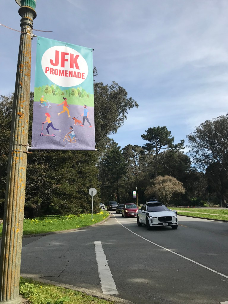 A Waymo leads the caravan of climate killing vehicles through a section of Golden Gate Park where cars can still pollute.