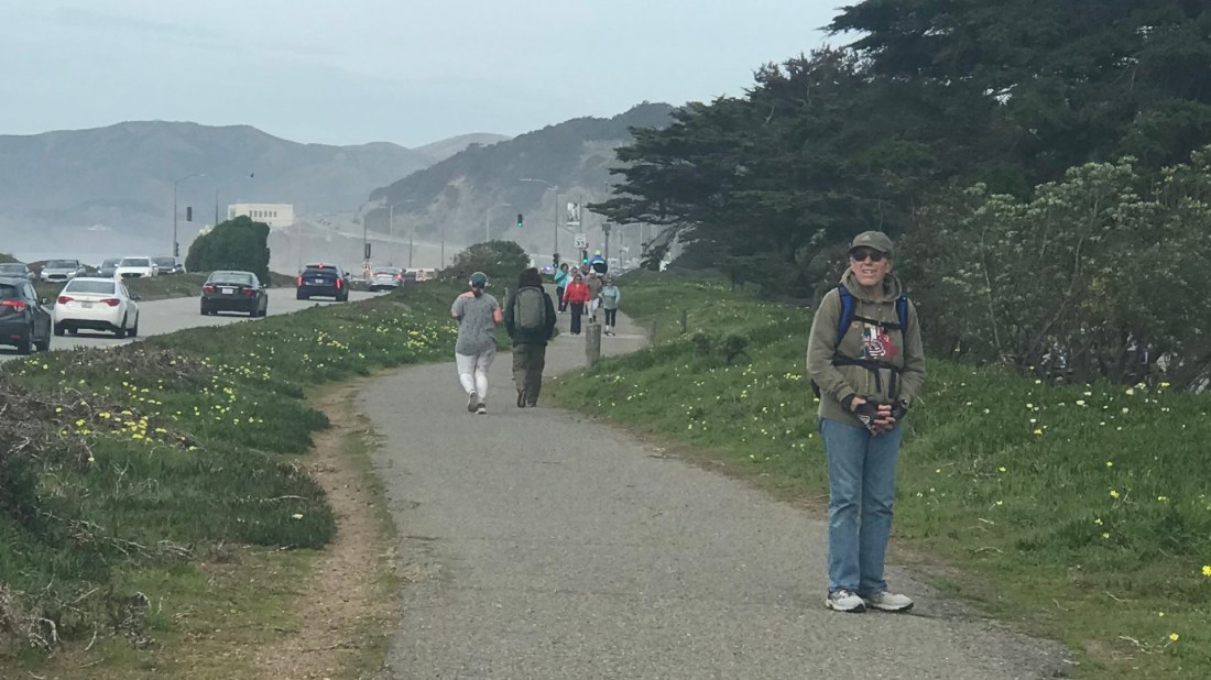 Liz Heidhues stands at the bus stop en route to the Sunset Dunes Park celebration. Blogger Lee and Liz have never owned a car. We have made our way through life in San Francisco raising two children utilizing bicycles, public transit and our feet. Using our bodies, our good health, our wits. Never succumbing to the typical American false need for a climate destroying car.